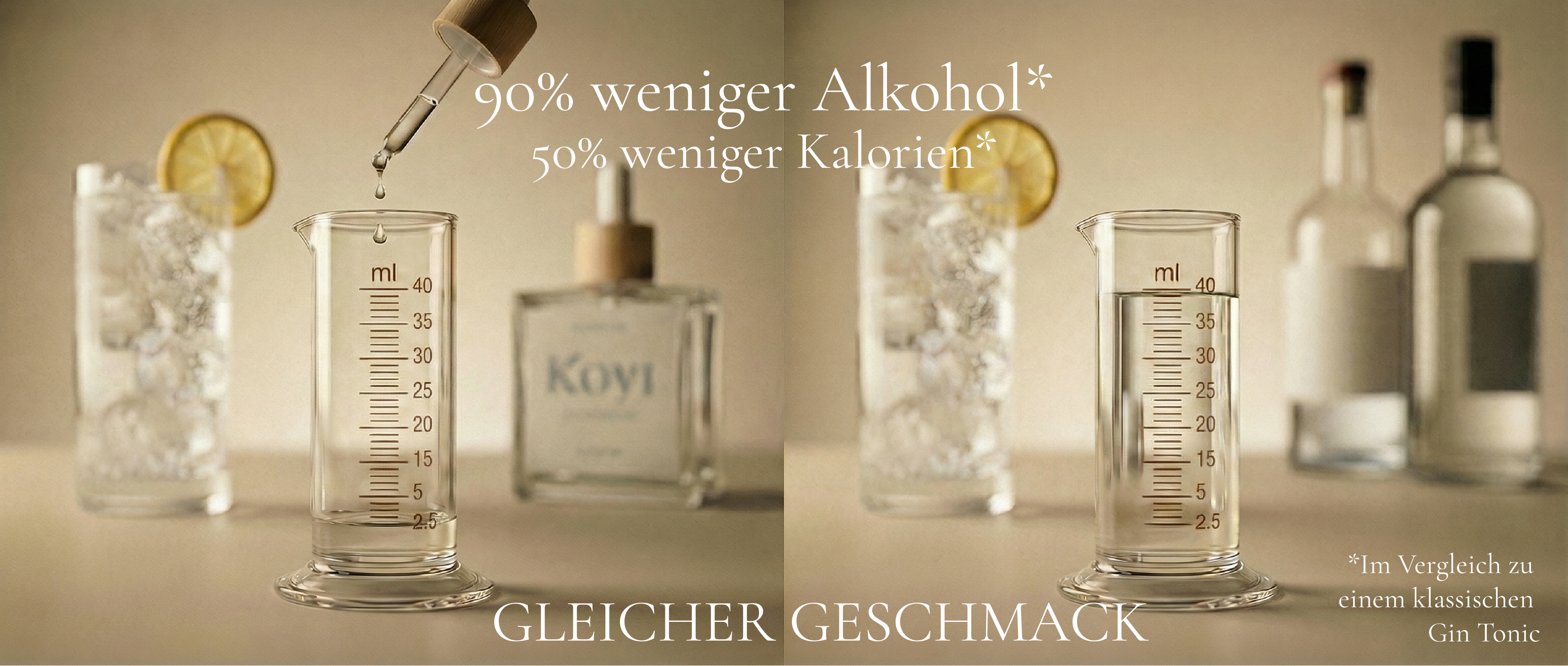 Wenn du also doppelt dosierst, ist das ungefähr wie zwei KOYI-Drinks in einem Glas – grob ~1/3 eines klassischen Gin Tonics (statt “fast nichts”).